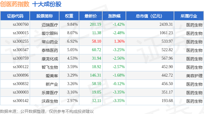 证券之星消息,1月16日,创医药(399275)指数报收于2822.29点,跌2.06%,成交280.66亿元,换手率2.83%。当日该指数成份股中,上涨的有8家,兴齐眼药以1.89%的涨幅领涨,下跌的有42家,迪安诊断以12.86%的跌幅领跌。