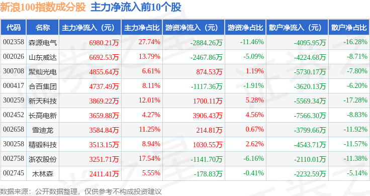资金流向方面,新浪100(399297)指数成份股当日主力资金净流出合计3.69亿元,游资资金净流入合计4.4亿元,散户资金净流出合计7135.88万元。成份股资金流向详情见下表: