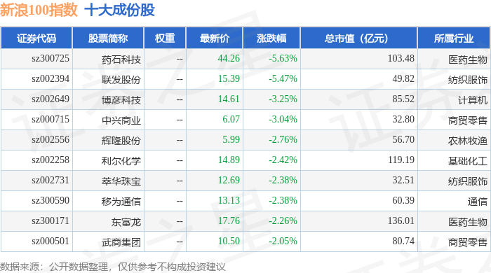 证券之星消息,1月16日,新浪100(399297)指数报收于6347.73点,涨0.24%,成交277.86亿元,换手率2.66%。当日该指数成份股中,上涨的有53家,森源电气以10.07%的涨幅领涨,下跌的有44家,药石科技以5.63%的跌幅领跌。