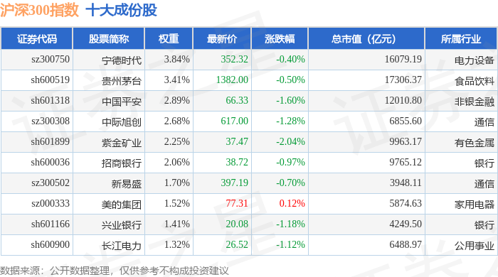 沪深300(399300)指数十大成份股详情如下: