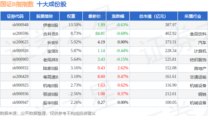 国证B指(399318)指数十大成份股详情如下: