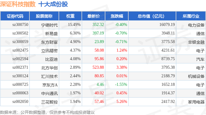 深证科技(399339)指数十大成份股详情如下: