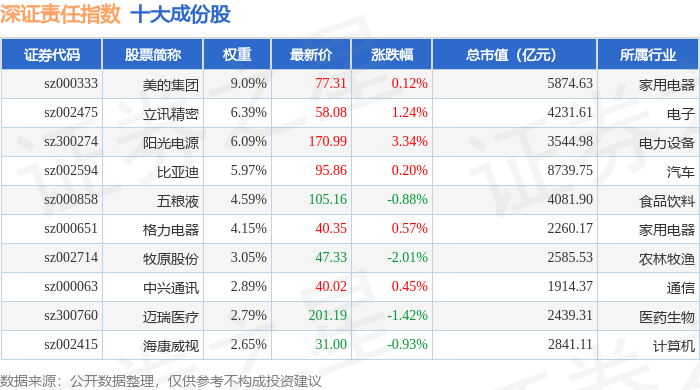 深证责任(399341)指数十大成份股详情如下: