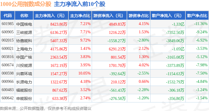 资金流向方面,1000公用(399390)指数成份股当日主力资金净流出合计22.75亿元,游资资金净流入合计14.37亿元,散户资金净流入合计8.38亿元。成份股资金流向详情见下表: