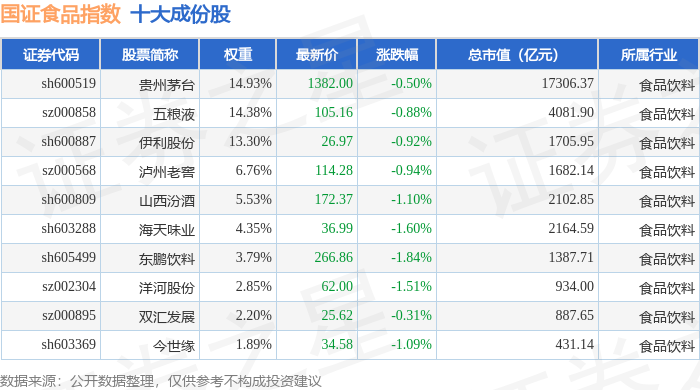 国证食品(399396)指数十大成份股详情如下: