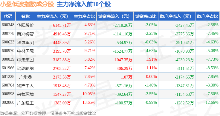 资金流向方面,小盘低波(399408)指数成份股当日主力资金净流出合计19.18亿元,游资资金净流入合计11.86亿元,散户资金净流入合计7.32亿元。成份股资金流向详情见下表: