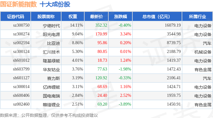 证券之星消息,1月16日,国证新能(399412)指数报收于3078.15点,涨0.31%,成交1214.27亿元,换手率1.78%。当日该指数成份股中,上涨的有34家,晶盛机电以9.12%的涨幅领涨,下跌的有14家,金风科技以9.99%的跌幅领跌。