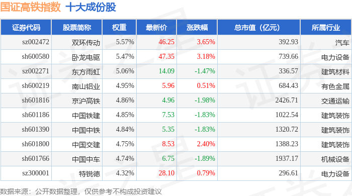 证券之星消息,1月16日,国证高铁(399419)指数报收于2217.61点,跌0.2%,成交302.57亿元,换手率1.63%。当日该指数成份股中,上涨的有23家,双环传动以3.65%的涨幅领涨,下跌的有27家,内蒙一机以4.02%的跌幅领跌。
