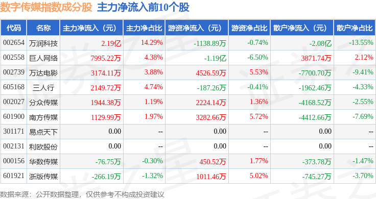 资金流向方面,数字传媒(399434)指数成份股当日主力资金净流出合计89.28亿元,游资资金净流入合计15.14亿元,散户资金净流入合计74.14亿元。成份股资金流向详情见下表:
