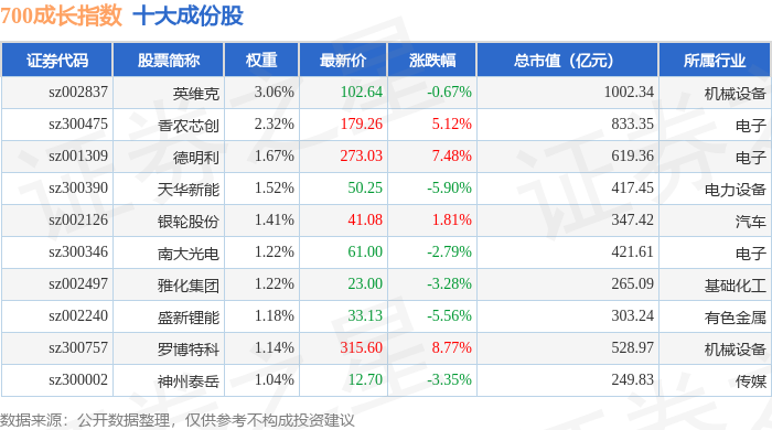 700成长(399628)指数十大成份股详情如下: