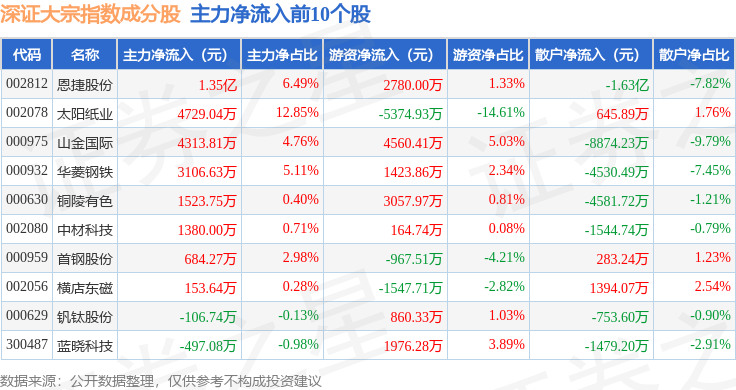 资金流向方面,深证大宗(399639)指数成份股当日主力资金净流出合计34.74亿元,游资资金净流入合计6.09亿元,散户资金净流入合计28.66亿元。成份股资金流向详情见下表: