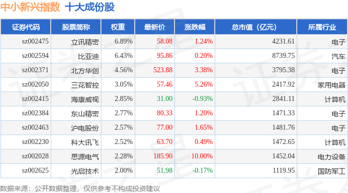 中小新兴(399642)指数十大成份股详情如下: