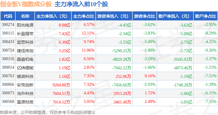 资金流向方面,创业板V(399668)指数成份股当日主力资金净流出合计26.86亿元,游资资金净流入合计9044.59万元,散户资金净流入合计25.96亿元。成份股资金流向详情见下表: