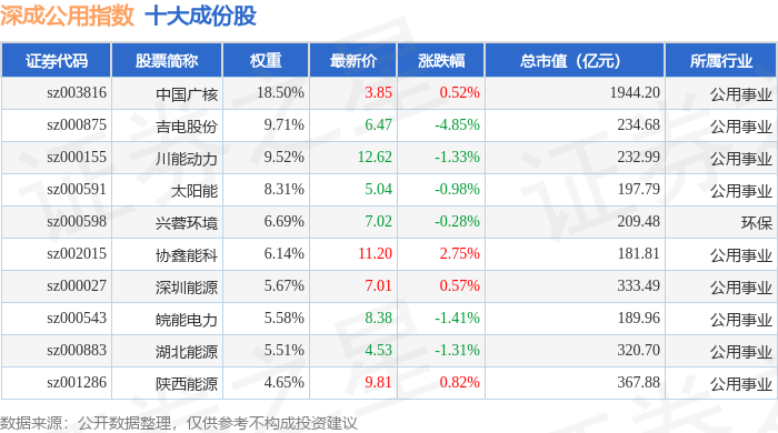 深成公用(399689)指数十大成份股详情如下: