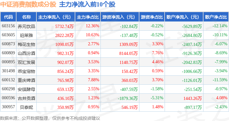 资金流向方面,中证消费(399932)指数成份股当日主力资金净流出合计16.15亿元,游资资金净流入合计7.31亿元,散户资金净流入合计8.84亿元。成份股资金流向详情见下表: