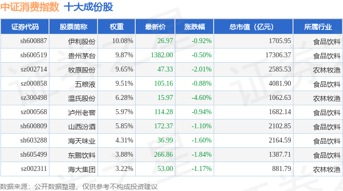 证券之星消息,1月16日,中证消费(399932)指数报收于15035.57点,跌1.17%,成交275.34亿元,换手率1.07%。当日该指数成份股中,上涨的有8家,养元饮品以5.33%的涨幅领涨,下跌的有30家,温氏股份以4.6%的跌幅领跌。
