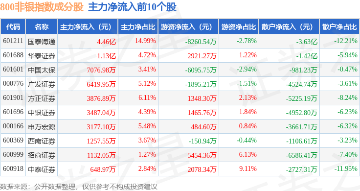 资金流向方面,800非银(399966)指数成份股当日主力资金净流出合计21.25亿元,游资资金净流入合计5.77亿元,散户资金净流入合计15.47亿元。成份股资金流向详情见下表: