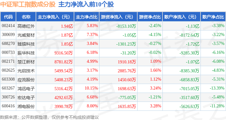 资金流向方面,中证军工(399967)指数成份股当日主力资金净流出合计69.7亿元,游资资金净流入合计25.28亿元,散户资金净流入合计44.42亿元。成份股资金流向详情见下表: