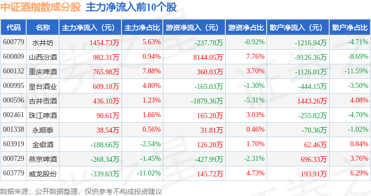 资金流向方面,中证酒(399987)指数成份股当日主力资金净流出合计8.92亿元,游资资金净流入合计5.34亿元,散户资金净流入合计3.58亿元。成份股资金流向详情见下表: