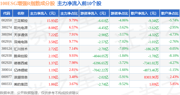 资金流向方面,100ESG增强R(470033)指数成份股当日主力资金净流出合计9.82亿元,游资资金净流出合计7.45亿元,散户资金净流入合计17.27亿元。成份股资金流向详情见下表: