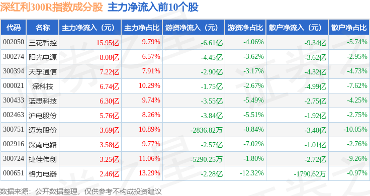 资金流向方面,深红利300R(470062)指数成份股当日主力资金净流入合计16.26亿元,游资资金净流出合计29.61亿元,散户资金净流入合计13.34亿元。成份股资金流向详情见下表: