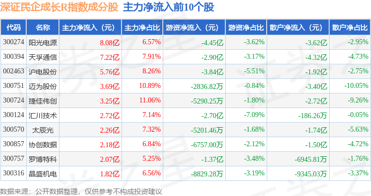 资金流向方面,深证民企成长R(470071)指数成份股当日主力资金净流出合计8.47亿元,游资资金净流出合计1.24亿元,散户资金净流入合计9.71亿元。成份股资金流向详情见下表: