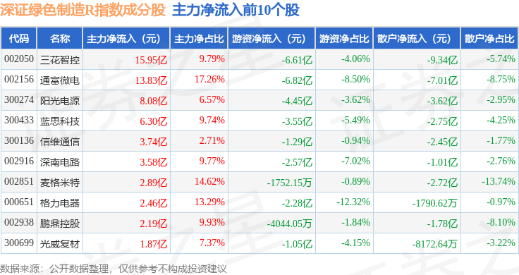 资金流向方面,深证绿色制造R(470069)指数成份股当日主力资金净流入合计28.25亿元,游资资金净流出合计21.8亿元,散户资金净流出合计6.45亿元。成份股资金流向详情见下表:
