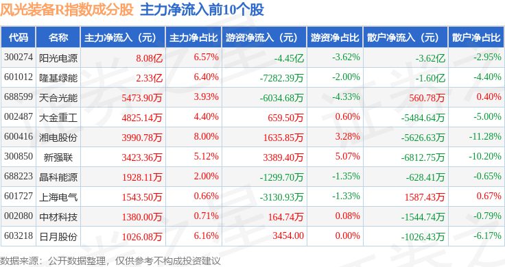 资金流向方面,风光装备R(480026)指数成份股当日主力资金净流出合计24.58亿元,游资资金净流入合计8.65亿元,散户资金净流入合计15.93亿元。成份股资金流向详情见下表: