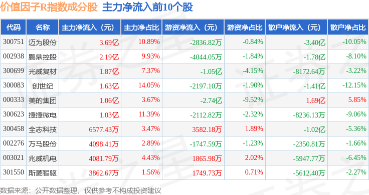 资金流向方面,价值因子R(480056)指数成份股当日主力资金净流出合计13.29亿元,游资资金净流入合计1.88亿元,散户资金净流入合计11.41亿元。成份股资金流向详情见下表: