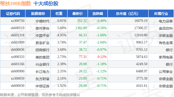 证券之星消息,1月16日,帮扶100R(480065)指数报收于2729.13点,跌0.56%,成交3218.7亿元,换手率0.56%。当日该指数成份股中,上涨的有25家,三花智控以5.26%的涨幅领涨,下跌的有74家,温氏股份以4.6%的跌幅领跌。