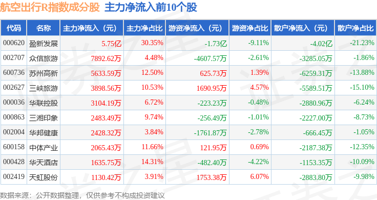 资金流向方面,航空出行R(480059)指数成份股当日主力资金净流出合计22.02亿元,游资资金净流入合计8.93亿元,散户资金净流入合计13.09亿元。成份股资金流向详情见下表: