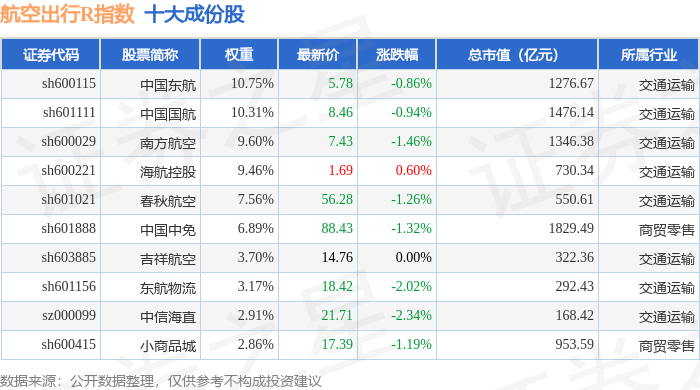 航空出行R(480059)指数十大成份股详情如下: