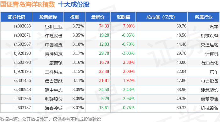 国证青岛海洋R(480532)指数十大成份股详情如下: