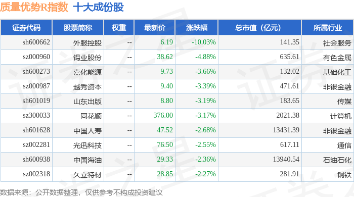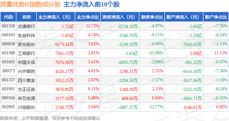 资金流向方面,质量优势R(489017)指数成份股当日主力资金净流出合计37.86亿元,游资资金净流出合计1788.16万元,散户资金净流入合计38.04亿元。成份股资金流向详情见下表: