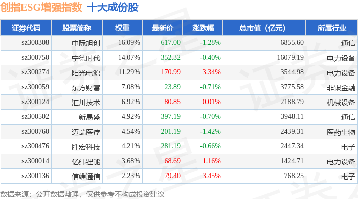 资金流向方面,创指ESG增强(970034)指数成份股当日主力资金净流入合计6.81亿元,游资资金净流出合计4.75亿元,散户资金净流出合计2.05亿元。成份股资金流向详情见下表: