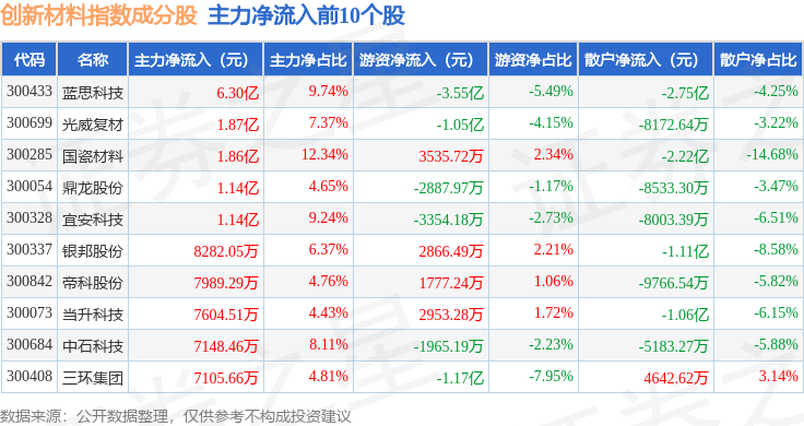 资金流向方面,创新材料(970039)指数成份股当日主力资金净流出合计17.36亿元,游资资金净流入合计9.03亿元,散户资金净流入合计8.33亿元。成份股资金流向详情见下表: