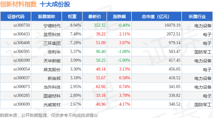 创新材料(970039)指数十大成份股详情如下: