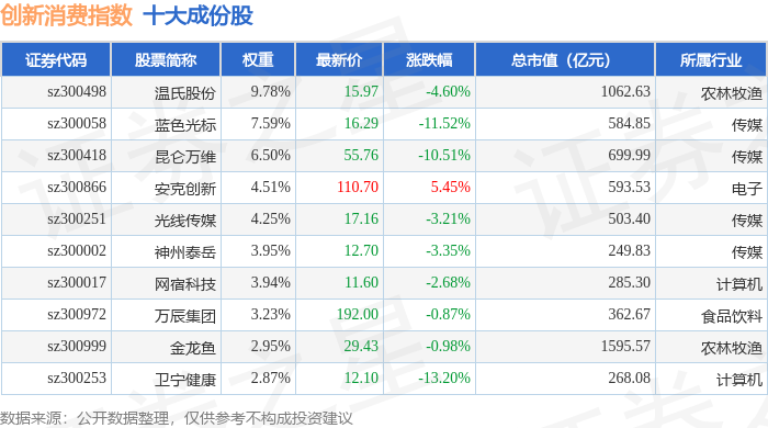 创新消费(970041)指数十大成份股详情如下:
