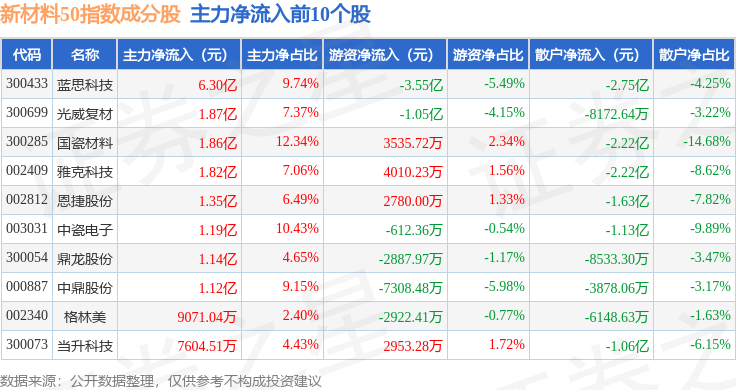 资金流向方面,新材料50(970042)指数成份股当日主力资金净流出合计19.0亿元,游资资金净流入合计5.75亿元,散户资金净流入合计13.25亿元。成份股资金流向详情见下表: