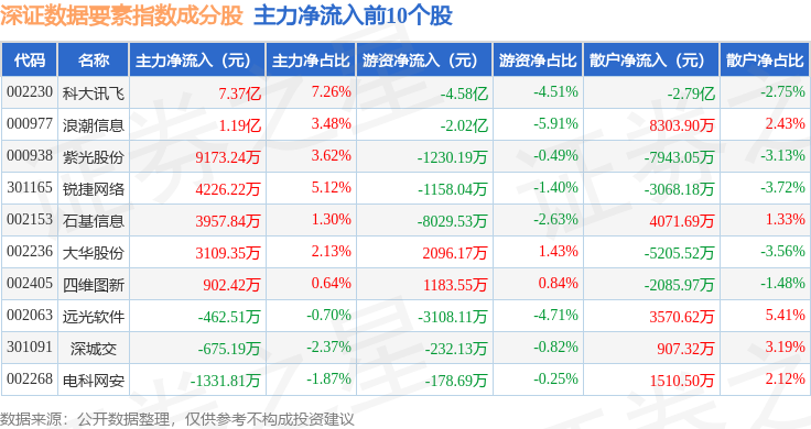 资金流向方面,深证数据要素(970053)指数成份股当日主力资金净流出合计82.12亿元,游资资金净流入合计8.14亿元,散户资金净流入合计73.98亿元。成份股资金流向详情见下表: