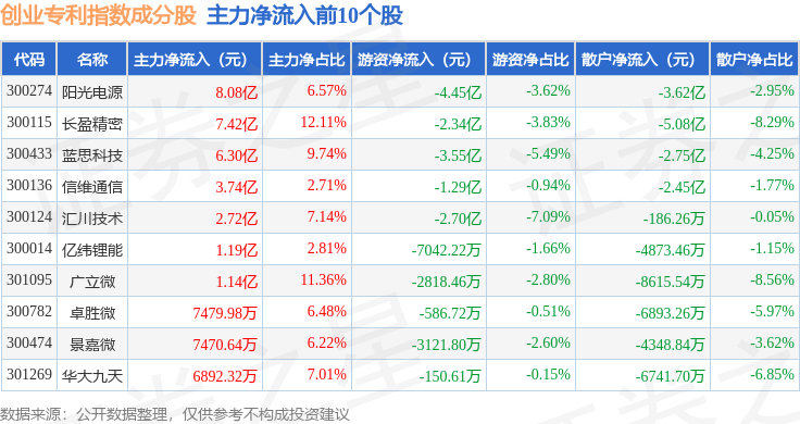 资金流向方面,创业专利(970068)指数成份股当日主力资金净流出合计1.09亿元,游资资金净流出合计3.45亿元,散户资金净流入合计4.54亿元。成份股资金流向详情见下表: