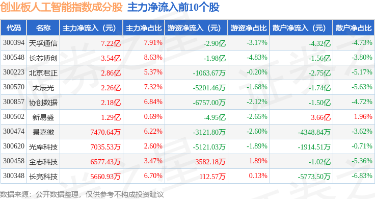 资金流向方面,创业板人工智能(970070)指数成份股当日主力资金净流出合计89.99亿元,游资资金净流入合计16.78亿元,散户资金净流入合计73.21亿元。成份股资金流向详情见下表: