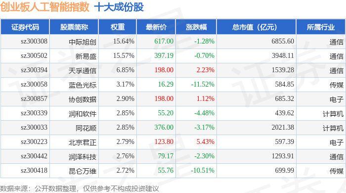 证券之星消息,1月16日,创业板人工智能(970070)指数报收于6518.31点,跌1.97%,成交1622.07亿元,换手率8.97%。当日该指数成份股中,上涨的有18家,星宸科技以8.14%的涨幅领涨,下跌的有31家,汉得信息以12.17%的跌幅领跌。