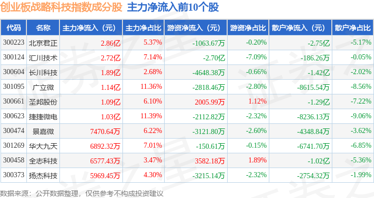 资金流向方面,创业板战略科技(971004)指数成份股当日主力资金净流出合计10.43亿元,游资资金净流入合计4.86亿元,散户资金净流入合计5.57亿元。成份股资金流向详情见下表: