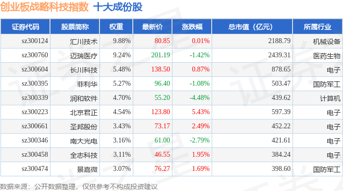 创业板战略科技(971004)指数十大成份股详情如下: