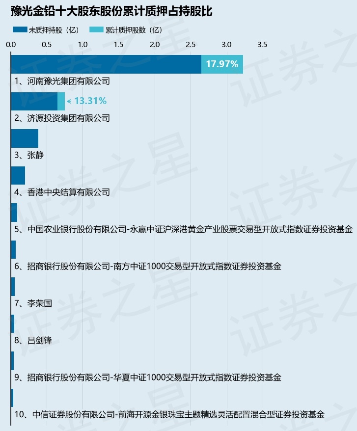 截止本公告日,股东河南豫光集团有限公司已累计质押股份5800.0万股,占其持股总数的17.97%,股东济源投资集团有限公司已累计质押股份1000.0万股,占其持股总数的13.31%。本次质押后豫光金铅十大股东的累计质押股份占持股比例(占持股比例的计算以公司最新一期财务报表公布的十大股东的持股总数为基准)见下图: