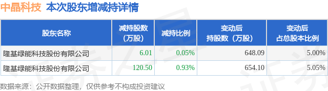证券之星消息,1月16日中晶科技发布公告《中晶科技:关于股东权益变动比例触及1%及5%整数倍暨披露简式权益变动报告书的提示性公告》,其股东隆基绿能科技股份有限公司于2026年1月14日至2026年1月15日间合计减持126.52万股,占公司目前总股本的0.976%,变动期间该股股价上涨2.48%,截止1月15日收盘报32.23元。