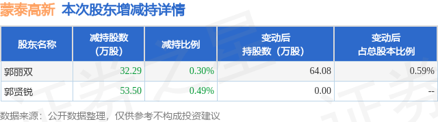 证券之星消息,1月16日蒙泰高新发布公告《蒙泰高新:关于股东减持股份触及1%整数倍的公告》,其股东郭丽双、郭贤锐于2025年12月11日至2026年1月15日间合计减持85.79万股,占公司目前总股本的0.7891%,变动期间该股股价下跌7.67%,截止1月15日收盘报31.65元。