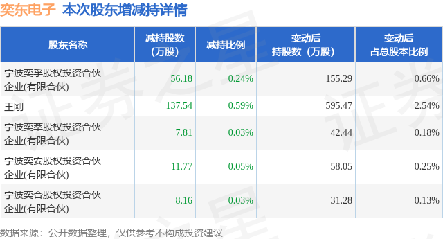 证券之星消息,1月16日奕东电子发布公告《奕东电子:关于控股股东、实际控制人的一致行动人减持计划期限届满暨减持结果的公告》,其股东王刚、宁波奕孚股权投资合伙企业(有限合伙)、宁波奕萃股权投资合伙企业(有限合伙)、宁波奕安股权投资合伙企业(有限合伙)、宁波奕合股权投资合伙企业(有限合伙)于2025年12月18日至2025年12月25日间合计减持221.47万股,占公司目前总股本的0.9439%,变动期间该股股价上涨49.98%,截止12月25日收盘报79.16元。
