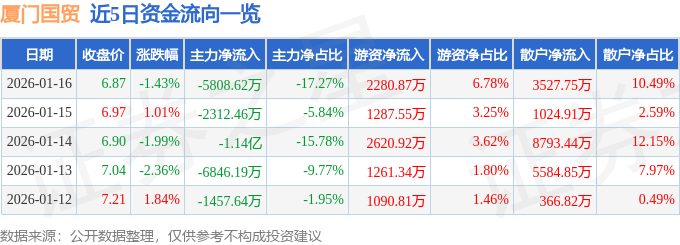 证券之星消息,截至2026年1月16日收盘,厦门国贸(600755)报收于6.87元,下跌1.43%,换手率2.28%,成交量48.7万手,成交额3.36亿元。